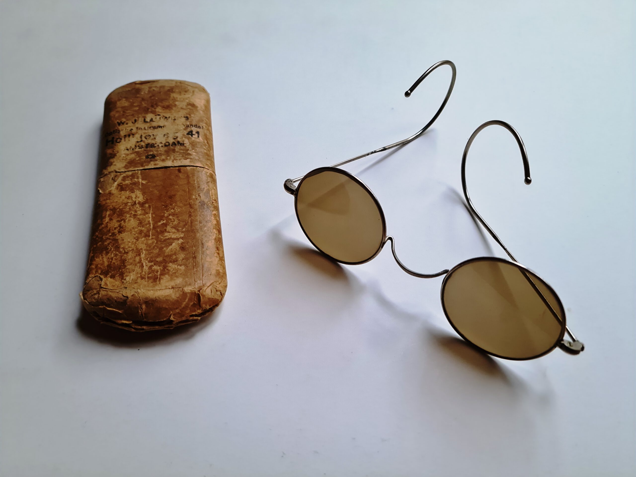 Zulke zonnebrillen met etui zouden voor de oorlog aan de trambestuurders in Amsterdam ter beschikking zijn gesteld. De ‘veren’ zijn inderdaad veren, en vormen zich precies naar de vorm van de oren.